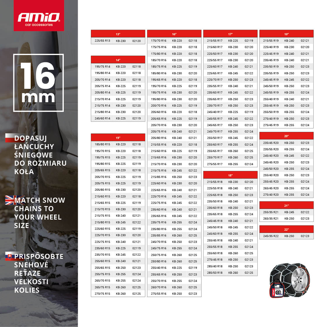 Epäsymmetrinen, rombinen ketjukuvio, joka suojaa ajoneuvoa liukastumiselta, etenkin kääntöliikkeen aikana. Nopea asennus ilman tarvetta ajaa auton yli. Yhteensopiva ABS: n ja ESP: n kanssa.
