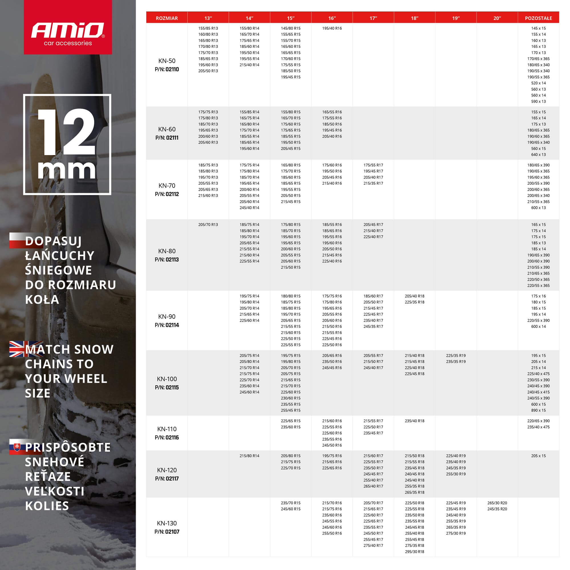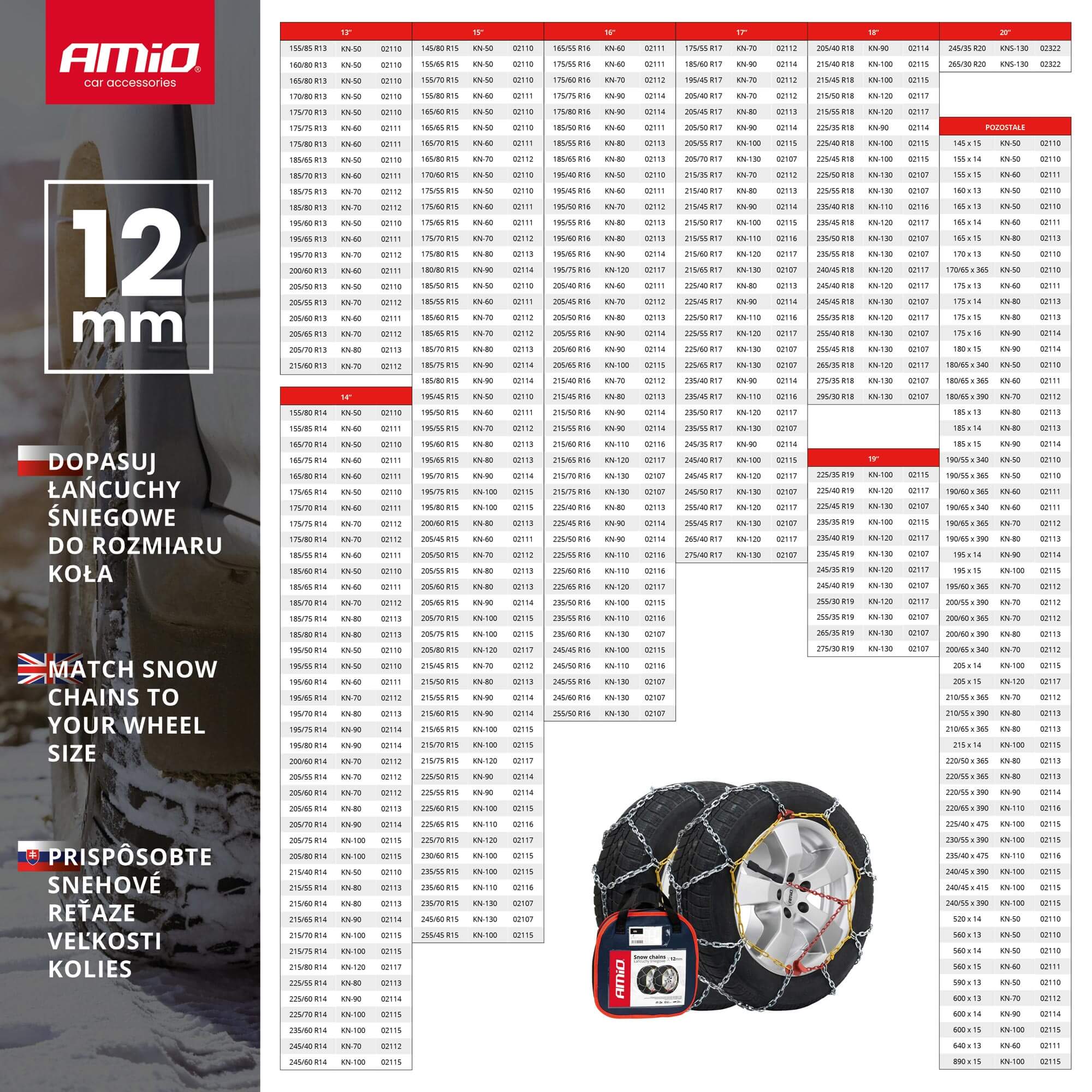 Epäsymmetrinen, rombinen ketjukuvio, joka suojaa ajoneuvoa liukastumiselta, etenkin kääntöliikkeen aikana. Nopea asennus ilman tarvetta ajaa auton yli. Yhteensopiva ABS: n ja ESP: n kanssa.