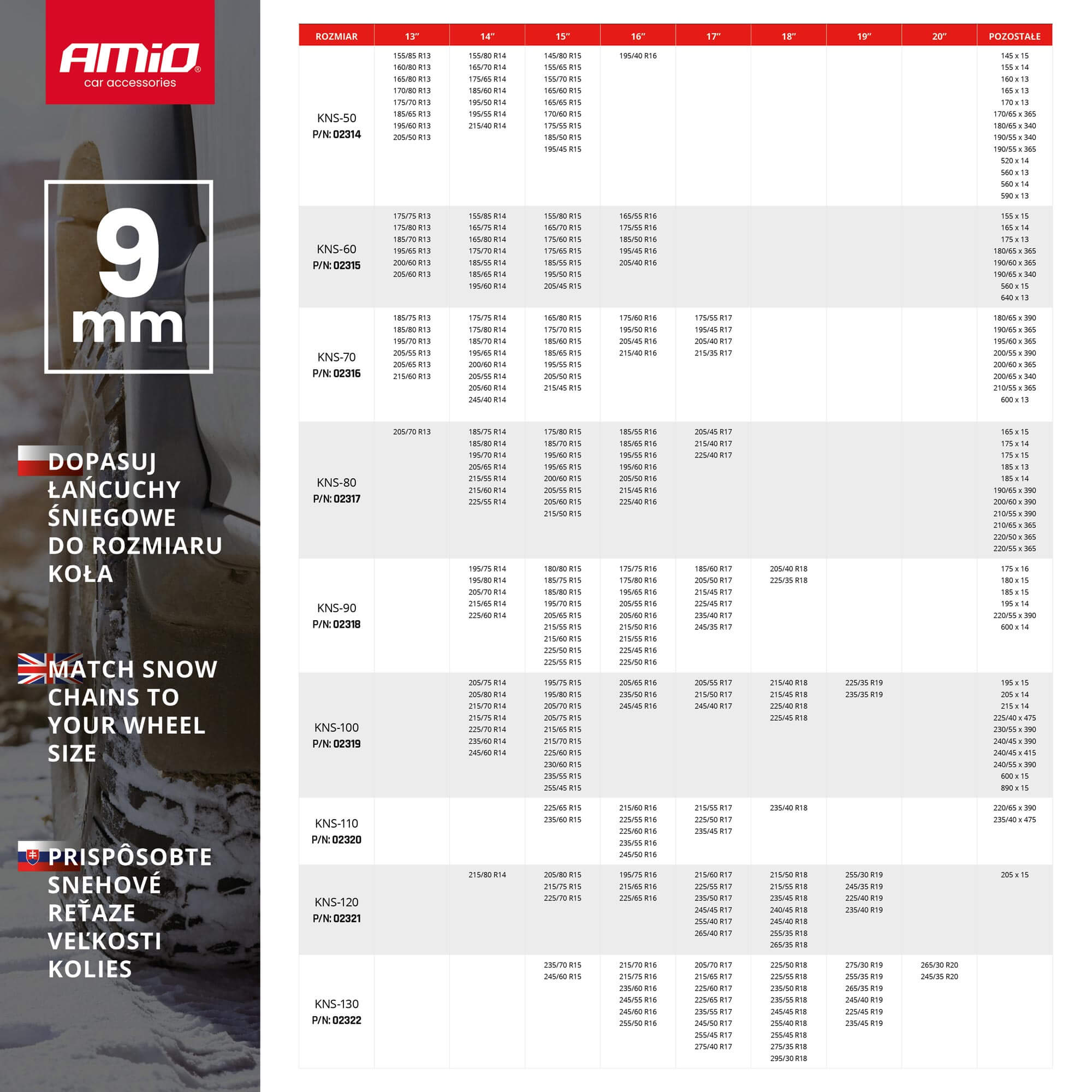 Epäsymmetrinen, rombinen ketjukuvio, joka suojaa ajoneuvoa liukastumiselta, etenkin kääntöliikkeen aikana. Nopea asennus ilman tarvetta ajaa auton yli. Yhteensopiva ABS: n ja ESP: n kanssa.
