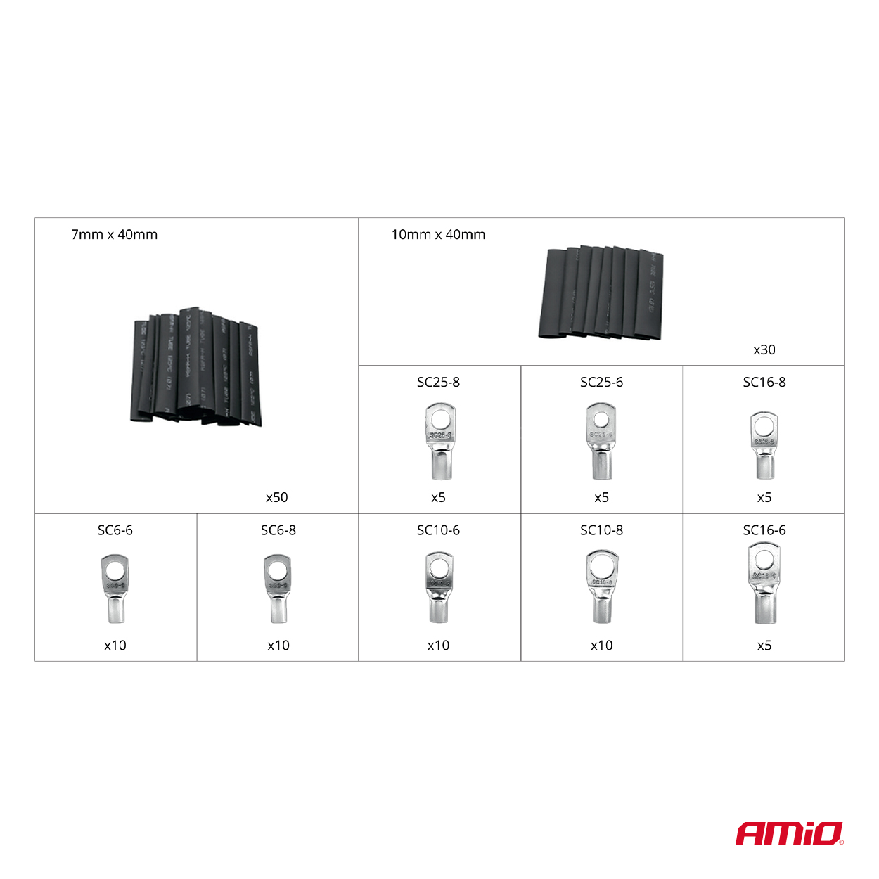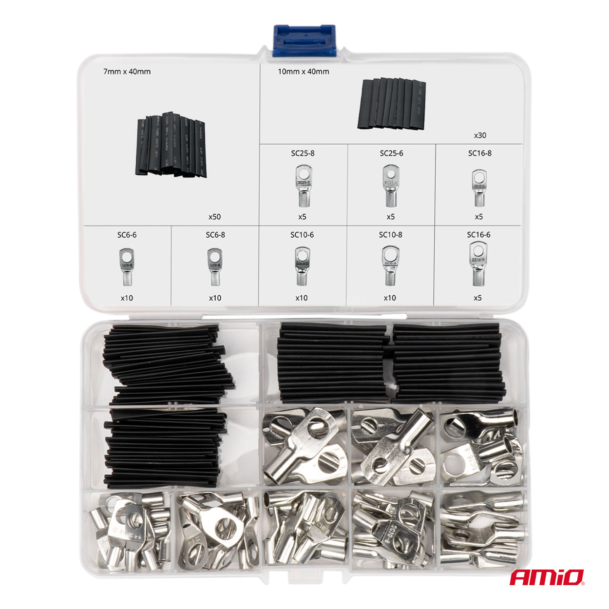 Silmukkaliittimet – Sarja sisältää 60 silmukkaliitintä, jotka mahdollistavat johtojen luotettavan ja kestävän liittämisen erilaisiin sovelluksiin, kuten autoihin, moottoripyöriin, sähköasennuksiin tai elektroniikkaan.