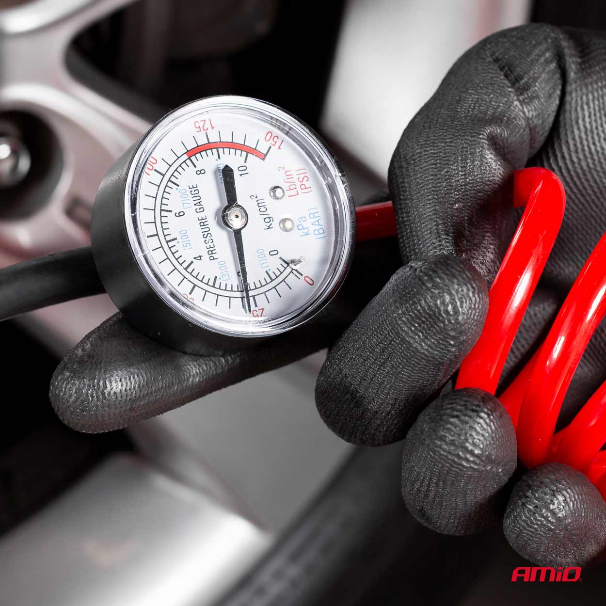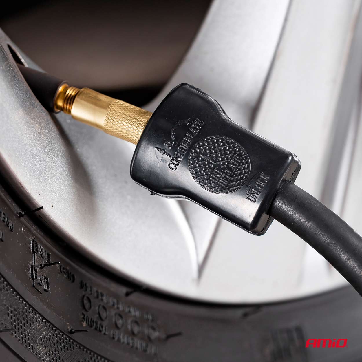 Tehokas, metallinen kaksimäntäkompressori painemittarilla. Kompressori on suunniteltu pyörien, pallojen, täytettävien astioiden, uima-altaiden ja muiden pumppaamiseen mukana olevien kolmen eri venttiilikärjen ansiosta. Käsittelee isopyöräisiä 4×4-autoja – Maastoauto – Pakettiauto – Telttailu