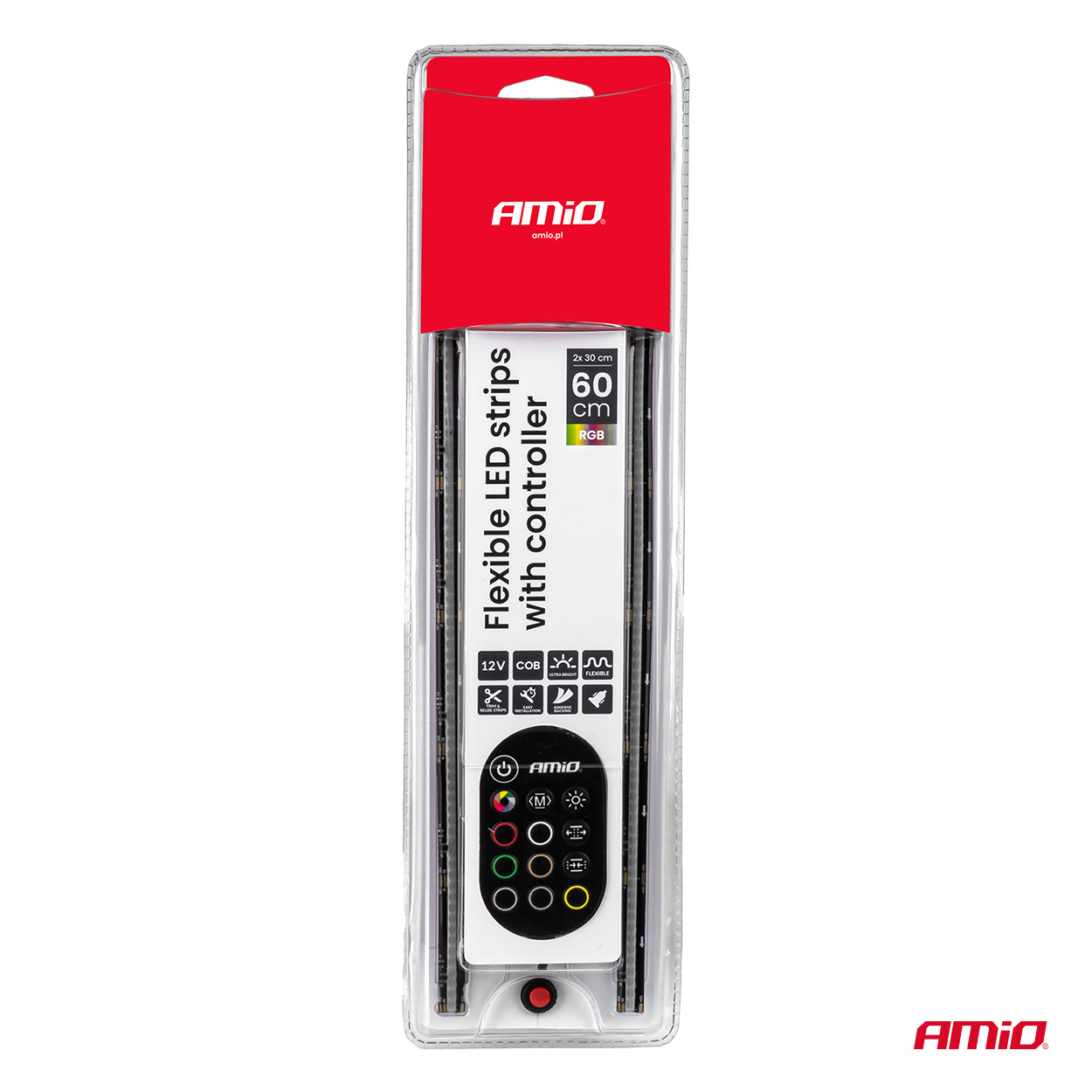 LED joustavat nauhat RGB-tekniikassa, virtalähteenä 12V -jännitteellä. Sarja sisältää kaksi 30 cm pitkää nauhaa ja kaukosäätimellä varustetun ohjaimen, jonka avulla voit vaihtaa värejä ja valaistustiloja. Suunnittelun ansiosta Joustava hihnat voidaan helposti säätää kiinnityspinnalle. Tuote on varustettu testitoiminnolla ”kokeile minua”, joka helpottaa toiminnan esittelyä myyntipisteissä.