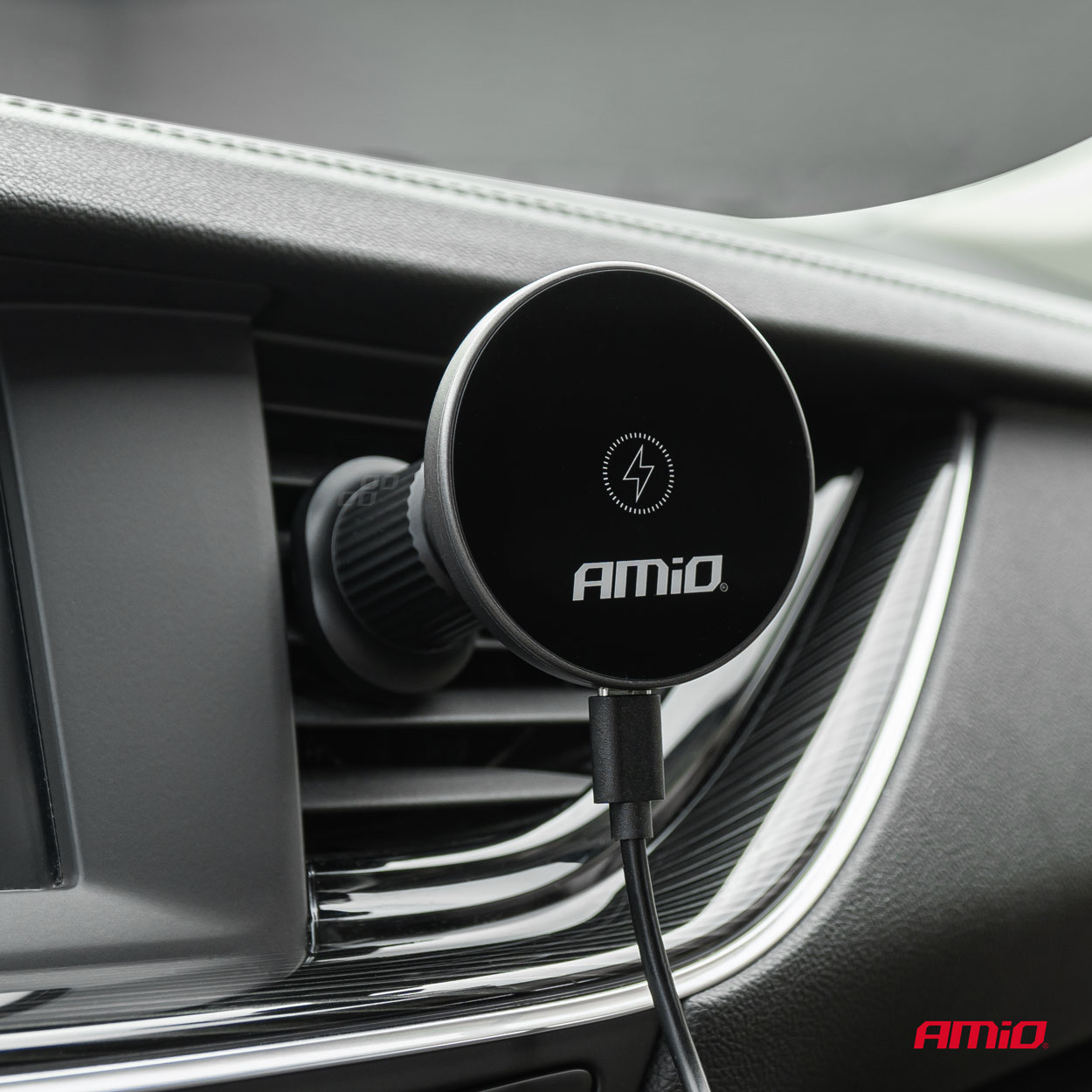 Autokiinnikkeen pidike kiinnitetty tuuletusritilään, 15 W: n langaton Qi-induktiolaturi Magsafe-laitteella.