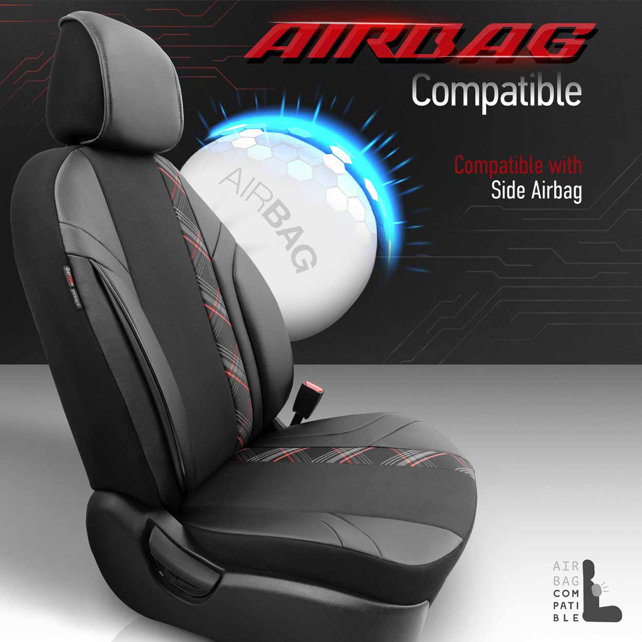 Päällysteissä on vakiovarusteena sertifioitu AIRBAG-sauma, joten ne sopivat molempiin autoihin sivuturvatyynyillä istuimissa sekä tavallisissa istuimissa. Erityisen sauman ansiosta ne peittävät istuimet kokonaan häiritsemättä turvatyynyjen toimintaa.