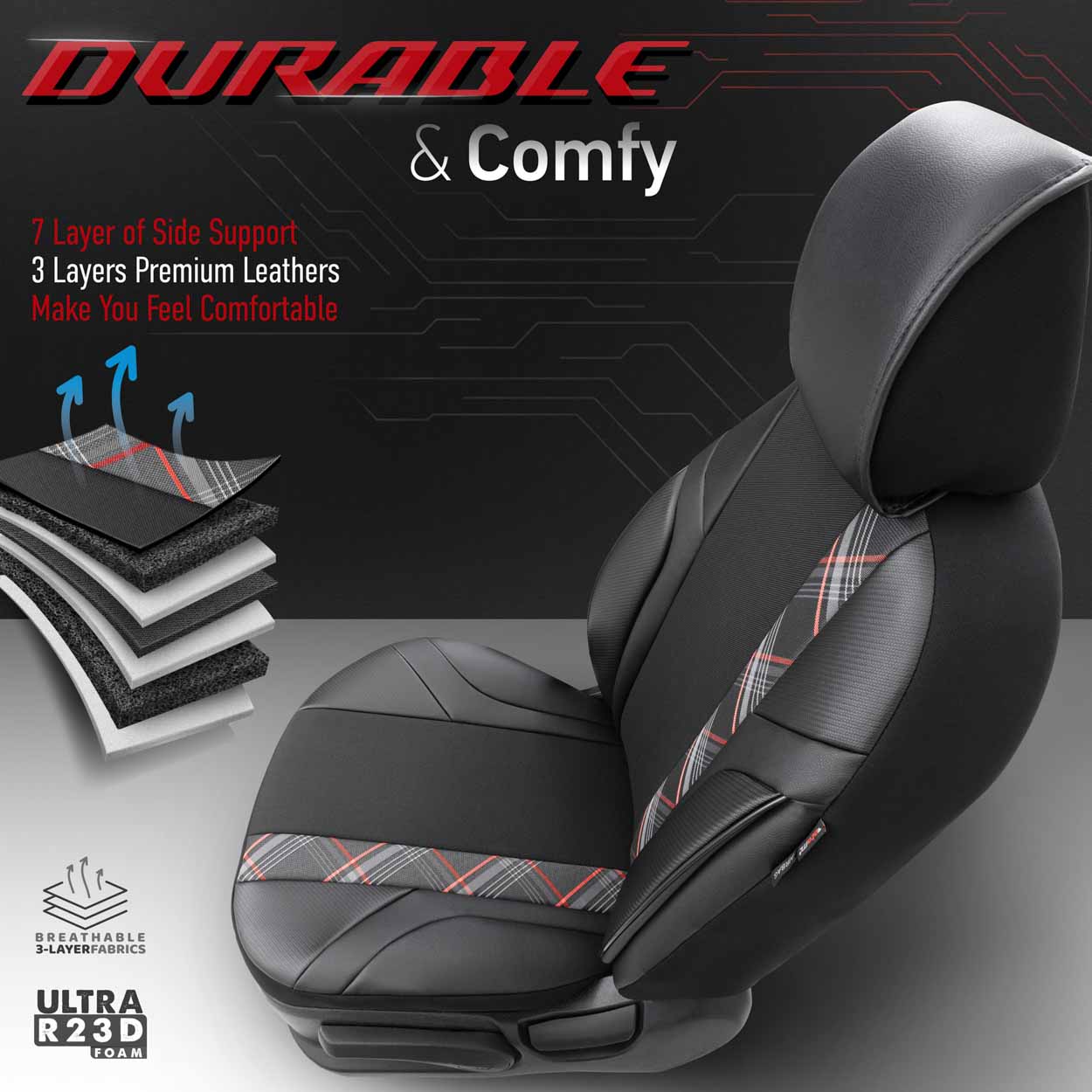Kaikki materiaalit on täysin laminoitu polyuretaanivaahdolla, mikä estää kansien liukumisen istuimiin nähden.