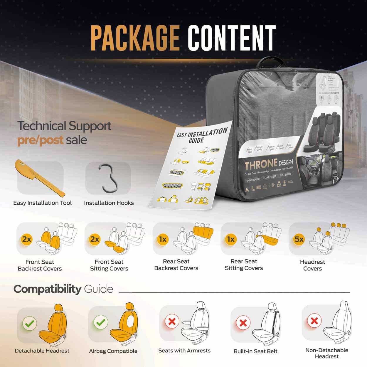 Päällysteissä on vetoketjut takasohvalla, joten sopii useimpiin markkinoiden istuimiin(Sunnuntain sohvat, jaettu oikealle ja vasemmalle). Voimme taittaa selkänojat ilman ongelmia matkatavaratilan lisäämiseksi.