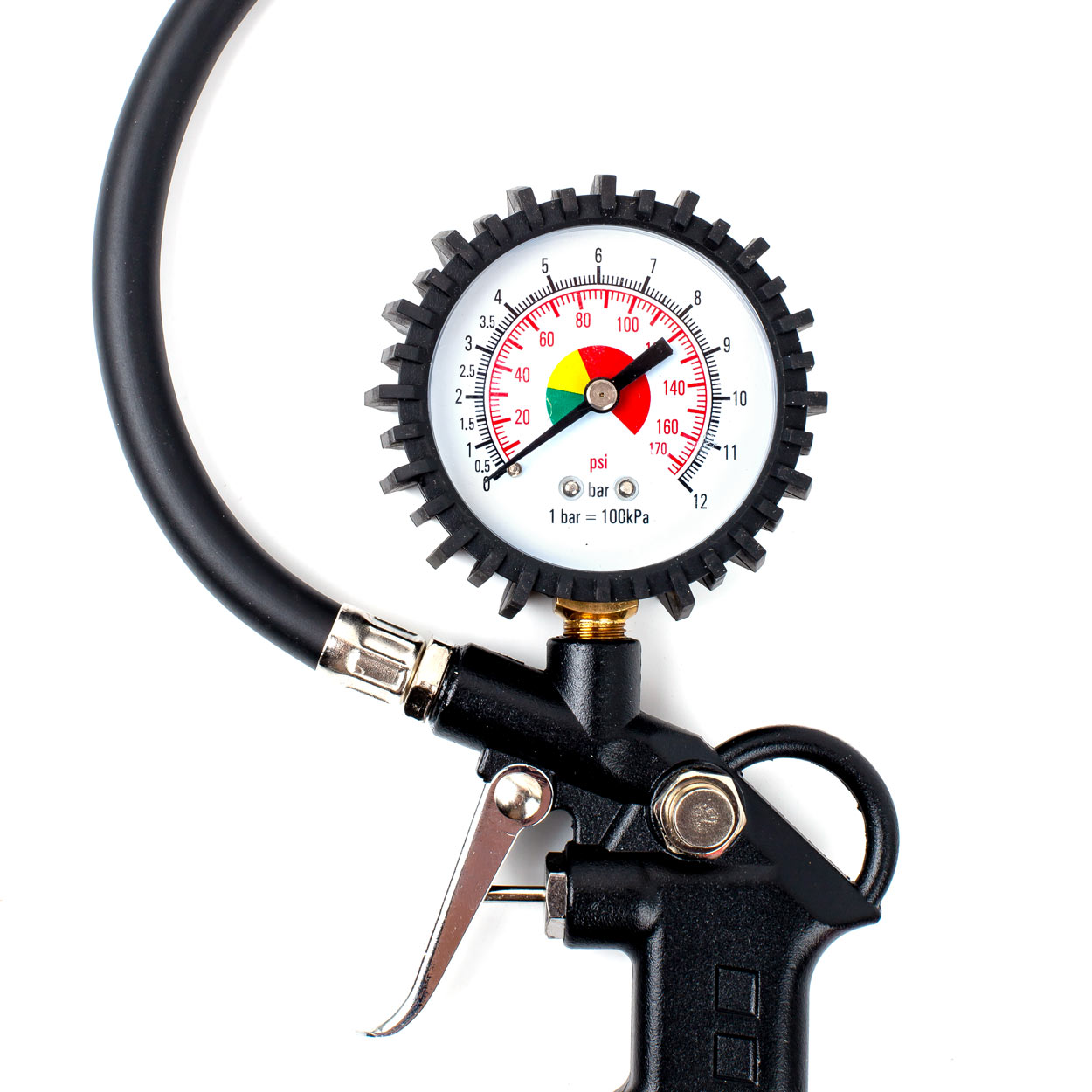Ilmapistooli pyörien pumppaamiseen painemittarilla on välttämätön työkalu missä tahansa autotallissa. Ase on kätevä, kevyt, käytännöllinen ja esteettisesti tehty. Pistoolissa on ilmanpoistoventtiili ja kumimanometrin kansi.