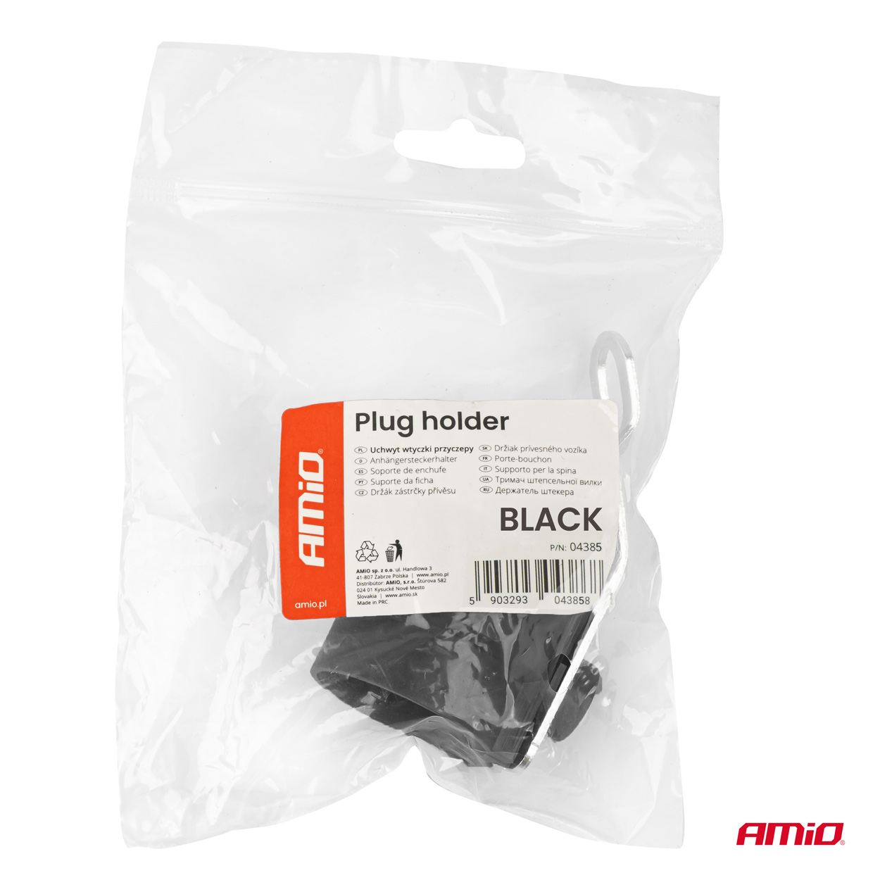 Käytännöllinen perävaunun pistokkeen pidike, musta, suunniteltu asennettavaksi ajoneuvon runkoon tai liitäntäpistokkeen lähelle. Mahdollistaa sähköpistokkeen turvallisen ja vakaan säilytyksen (7 tai 13 PIN) paikallaan tai kun sitä ei ole kytketty ajoneuvoon.
