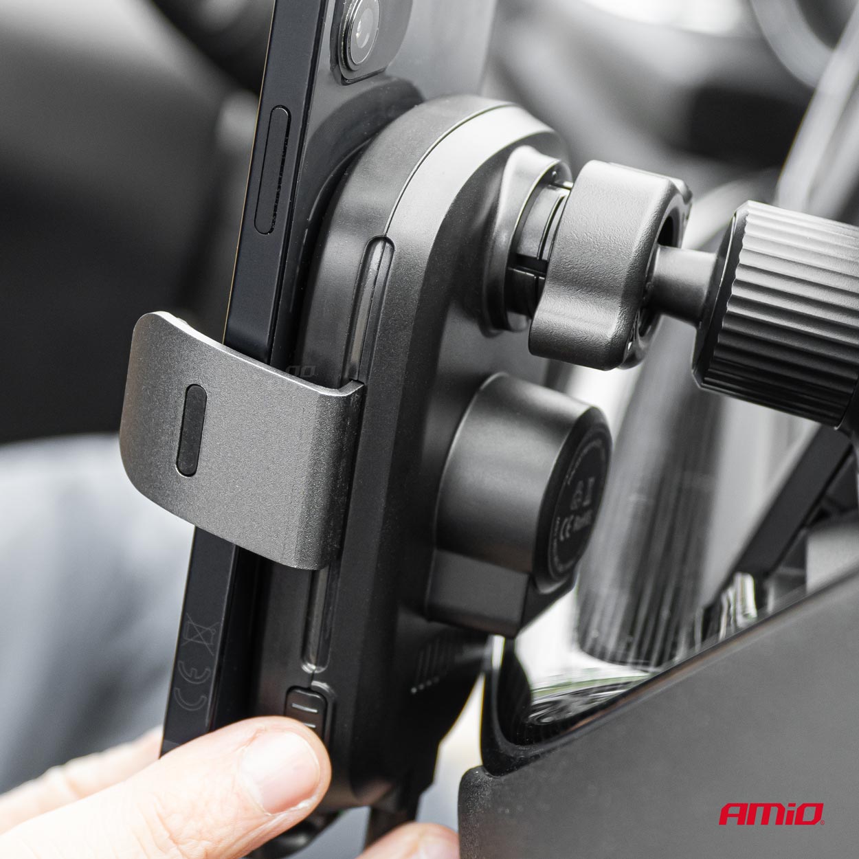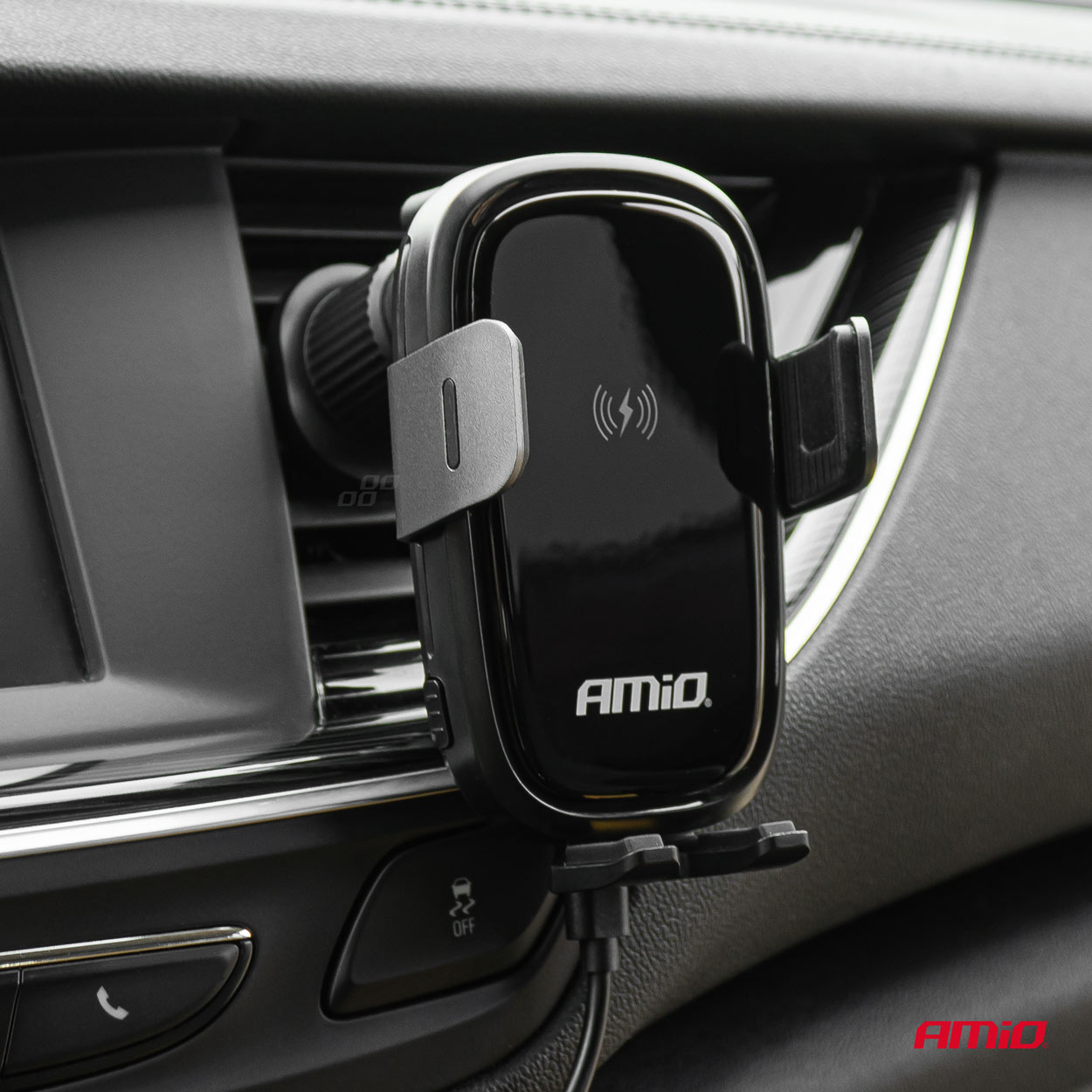 AmiO: n innovatiivinen ja tyylikäs pidike 15 W induktiolaturilla. Kahvaa voidaan kääntää 360 astetta, voimme käyttää puhelinta sekä pysty- että vaakasuunnassa. Rakenteensa ansiosta asennamme kahvan tuuletusritilään ilman ylimääräisiä ruuveja, nauhoja tai liimaa.