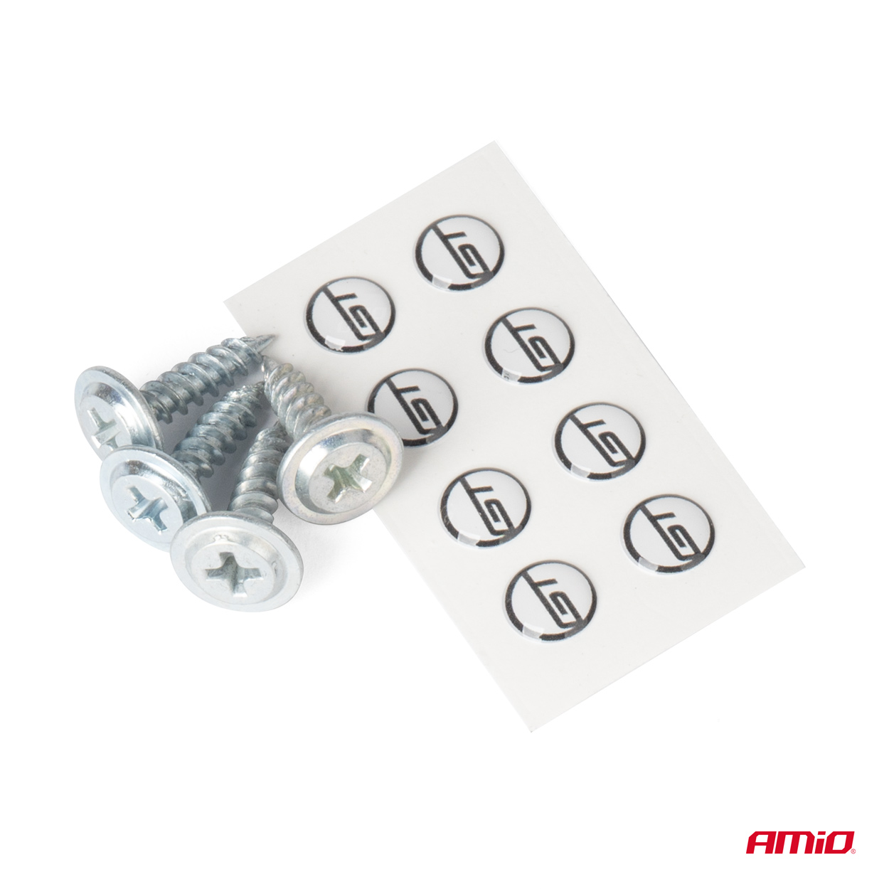 - Sisältää: 2 rekisterikilven pidikettä, 4 kiinnitysruuvia, 8 liukumatonta tarraa, asennusohjeet