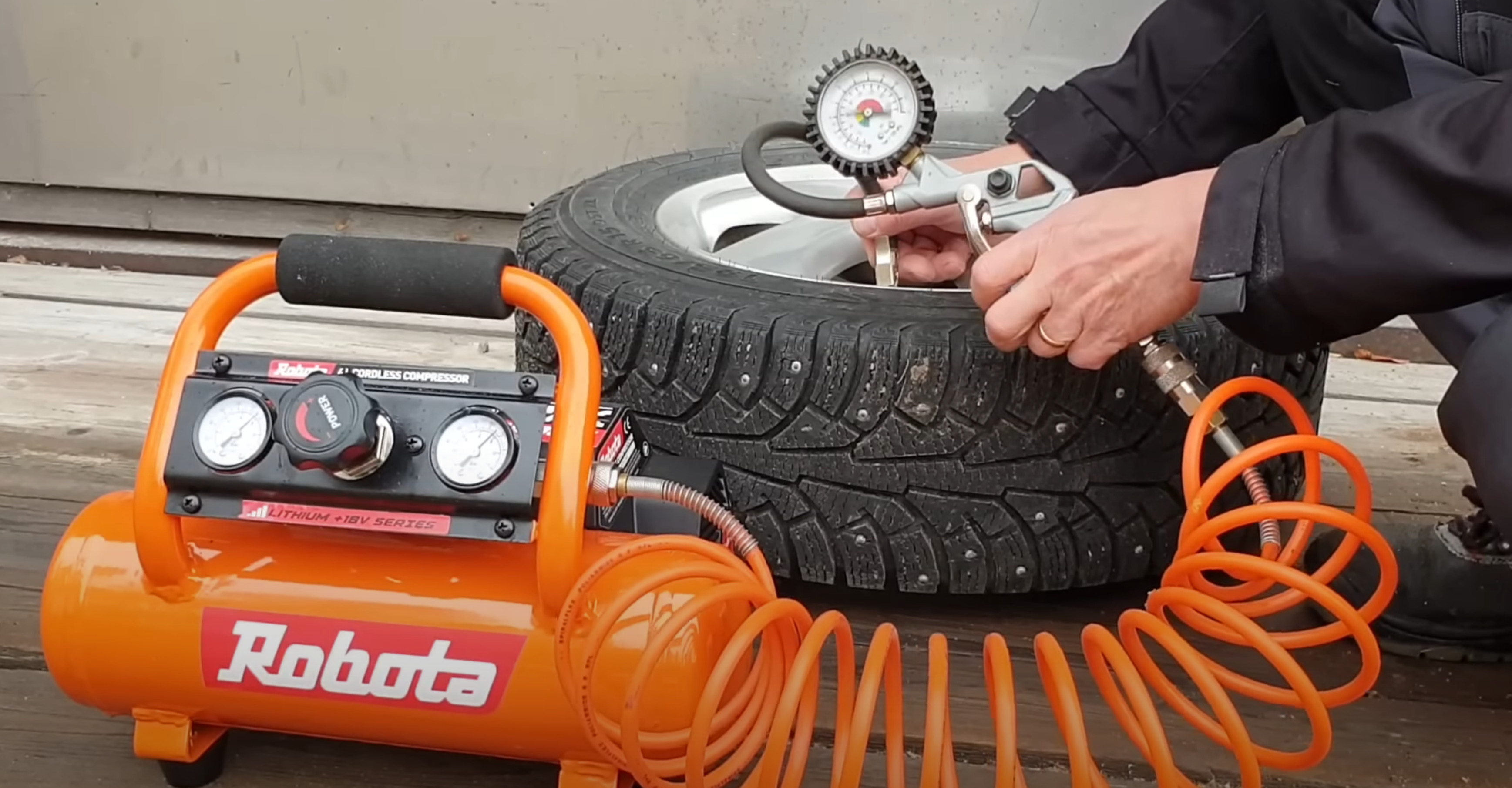 Robota pienikokoinen akkukäyttöinen kompressori.