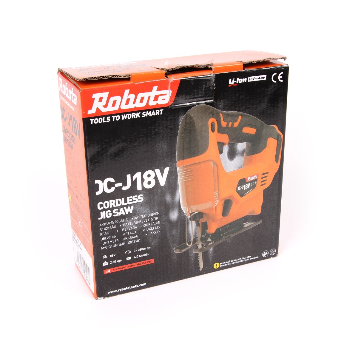 Robota akkukäyttöinen pistosaha kolmiasentoisella heiluritoiminnolla. Pistosahan iskun pituus on 26 mm ja työstökapasiteetti puulle 130 mm, teräkselle 10 mm ja alumiinille 20 mm.Akun jännite: 18 V Kierrosnopeus: 0-2600 rpm Paino: 1,6 kg Ei sisällä akkua ja laturia