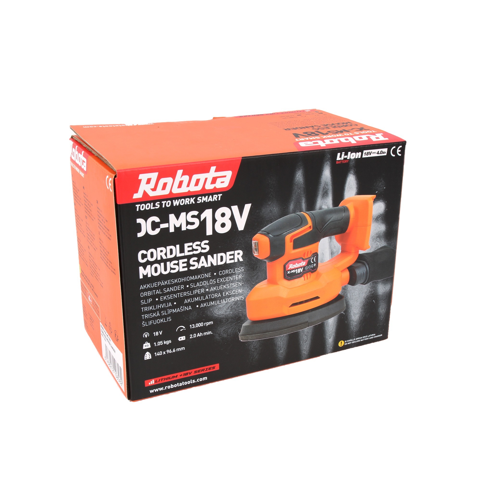 Kätevä johdoton epäkeskohiomakoneRobotan akkukäyttöinen hiomakone tuottaa siistin ja tasaisen jäljen hiotulle pinnalle. Hiomakoneen käyttö on helppoa ja tehokasta.Tekniset tiedot:Hiomatyynyn koko 140×96.6 mm. Koneen jännite: 18 V, akun minimi koko: 2.0 Ah. Nopeus: 13.00 rpm. Hiomapaperin kiinnitys: tarra. Mukana pölynkerääjä, kone voidaan myös liittää puruimuriin. Ei sisällä akkua ja laturia