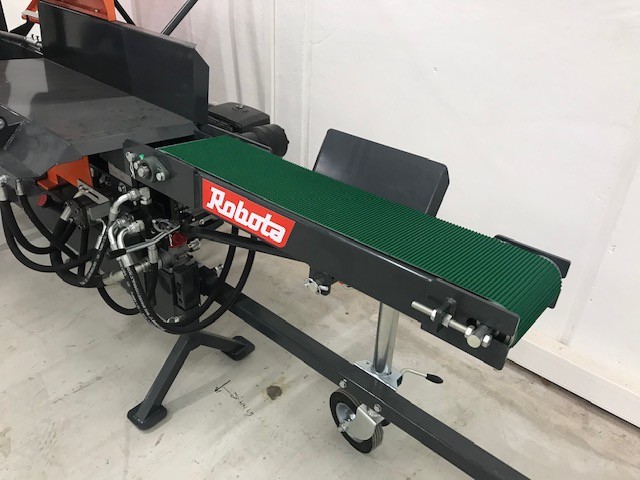 Tämä versio toimitetaan valmiiksi kasattuna ja koekäytettynä.Robota Klapix RB7-T pilkekone on täydellinen kotitalouden polttopuulaitos. Tällä koneella teet yli 30cm halkaisijaltaan olevat rangat polttopuiksi käden käänteessä. Klapikone koostuu neljästä osasta: Syöttöpäästä, katkaisuosasta, halkaisijasta sekä poistokulettimesta. Syöttöpää: Syöttöpää on varustettu voimakkaalla kuljettimella jonka avulla syötät rangan katkaisuosalle helposti ja nopeasti. Nostat vain rangan syöttöpään päällä olevalle kuljettimelle ja tämän jälkeen ajat hydraulisen moottorin avulla rangan kohti katkaisuterää. Kuljettimen matto on vahvaa uretaania jonka pinta on karhennettu. Näin puu liikkuu varmasti eteen ja taakse. Katkaisuosa: Koneen keskellä on katkaisuosa jossa katkaisuterä, tukipuristin ja teränvoitelujärjestelmä sijaitsevat. Katkaisuosassa on myös säädettävä rajoitin, millä määrätään katkaistavan klapin pituus. Katkaisuterä ja laippa saavat voitelun teräketjuöljy säiliöstä joka on sijoitettu toiselle puolelle konetta. Teräketjuöljyn määrää voi säätää. Kun puu on siirretty syöttöpään kuljettimen avulla rajoitinta vasten, puristeaan se jämäkästi koneen rukoa vasten tukipuristimella. Lopuksi puu katkaistaa katkaisuterän avulla jonka jälkeen katkennut klapi tippuu halkaisijalle. Maksimi puun paksuus on 35cm.Halkaisija: Kun katkennut klapi tippuu pyöreänä halkaisijalle halkaisutoiminto käynnistyy välittömästi. 12TON tehokas halkaisussylinteri työntää klapin neliteräiseen halkaisuterään joka halkaisee sen. Halkaisuterän korkeutta voi säätää koneen sivussa olevasta vivusta. Mikäli jostain syystä puu tippuu poikittain halkaisijalle, toiminto voidaan keskeytää turvallisesti, jonka jälkeen suojakuori aukaistaan ja puu asetetaan terälle käsin. Tämän jälkeen kuori laitetaan takaisin kiinni ja halkaisutoiminto käynnistetään manuaalisesti. Halkaisutoiminto ei käynnisty jos suoja kuori on auki. Lisäksi koneeseen on saatavana lisävarusteena kuusiteräinen halkaisuterä. Poistokuljetin: Lopuksi haljenneet polttopuut siirtyvät kuljettimelle jonka avulla klapit nousevat korkealle pudoten alas esim. säkkiin tai kekoon. Kuljettimen korkeutta ja kaltevuutta voi säätää käsivinssin avulla. Kuljettimen matto on uretaanipohjainen jossa on erilliset siivet jotka varmasti ottaa kiinni siirrettävästä polttopuusta. Kun kuljetinta ei käytetä ja kone laitetaan varastoon, voidaan kuljetin kääntää kaksinkerroin jolloin säilytystilan tarve pienenee huomattavasti. Yleistä Robota Klapix pilkekoneesta: Robota Klapix pilkekoneessa on laadukas 13hp Lifan nelitahtimoottori joka pyörittää suurikokoista hydrauliikkapumppua. Kone saa voimansa pumpulta jonka teho riittää varmasti hyvin kaikkiin toimintoihin. Koneen runko ja muut osat ovat pulverimaalattua terästä joka kestää kovaa käyttöä. Koneessa on suurikokoinen laippa ja ketju jonka avulla puut katkeaa helposti. 12Ton halkaisusylinteri halkaisee ne vaikeimmatkin “janahus” koivut kevyesti. Konetta voidaan siirtää kätevästi esim. mönkijällä, traktorilla tai autolla koska siinä on renkaat ja vetokita. Tieliikenne käyttöön sitä ei ole tehty ja max nopeus siirroille on 20km/h.Jos etsit pilkekonetta kotitarve käyttöön, edulliseen hintaan ja hyvillä ominaisuuksilla niin Robota on erinomainen vaihtoehto. Robotan nopeus jää jälkeen markkinoiden koville ammattilaiskoneille, mutta se on huomioitu hinnassa. Robota klapikone RB7-T tekniset tiedot:Paino: 650 kgPituus ( kuljetusasennossa ): 3,7 mPituus ( työasetuksessa ): 6,1 mAkseliväli: 1180 mmRengaskoko: 135/70R12Moottori: Lifan 13hp 4-Stroke nelitahtimoottoriHydrauliöljysäiliön tilavuus: 40 litraaÖljyn tyyppi: 32S HydrauliikkaöljyMoottoriöljy: 10W30Teräketjuöljysäiliön koko: 3 litraa, portaaton säätöSyöttöpöytä: Hydrauliikkamoottorilla pyörivä hihna, vipuohjausHalkaisuterä: 4-osaan halkaiseva ( lisävarusteena 6-osainen terä )Halkaisuterän säätö: 9 eri korkeutta Teräketjun pyöritys: Hydrauliikkamoottorin pyörittämä ketju, vipuohjausHalkaisunopeus: 0.5 m / sekHalkaistavan klapin pituus: 25 – 53 cmHalkaistavan puun max. halkaisija: ø 35 cmHalkaisuvoima: 12 tonniaKlapikuljettimen pituus: 3.35m, korkeus / kulma säädettävissä (1.4m-2.7m)Pintakäsittely: PulverimaalausHuom: Rahti mannersuomeen kokoamattomana 250,- ja koottuna 500,- 6 osainen halkaisuterä 150,- Tiedustelut Puh. 040 592 6821