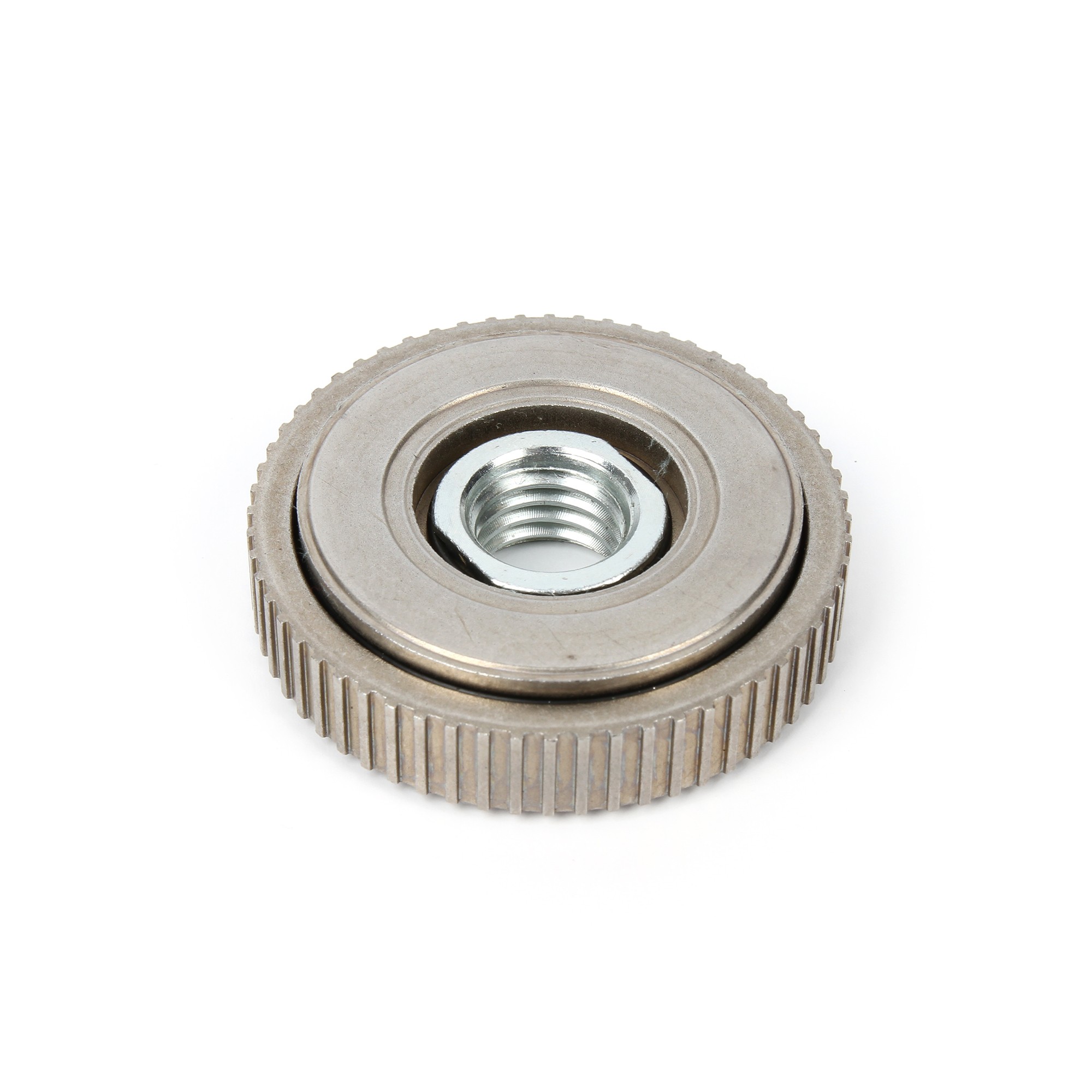 Kulmahiomakoneen pikakiinnitysmutteri M14 kierteellä. Unohda jumittuvat laikkamutterit!