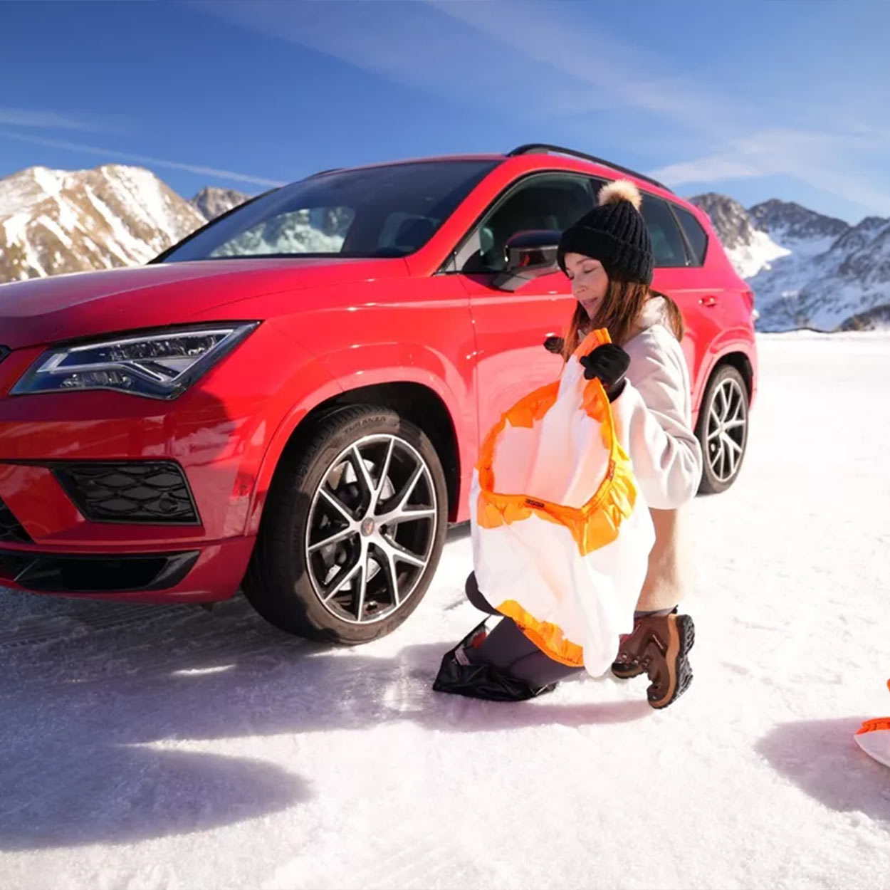 - Helppo asentaa: Intuitiivinen ja nopea asennus ilman työkaluja. Lumiketjut voidaan kiinnittää ja poistaa muutamassa minuutissa.