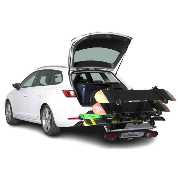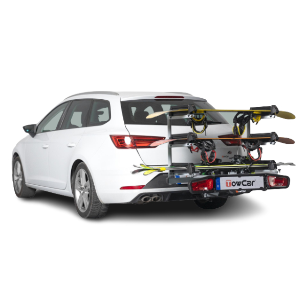 TowCar Aneto vetokoukkuun kiinnitettävä suksi/lumilautateline. Suksitelineellä voit kuljettaa turvallisesti 4 suksiparia tai 4 lumilautaa (tai vaihtoehtoisesti 2 suksiparia ja 2 lumilautaa).